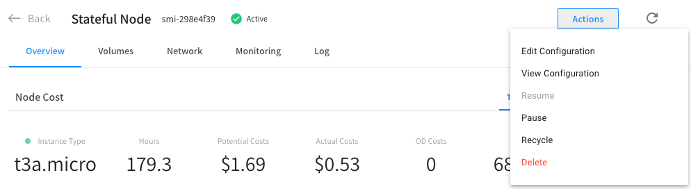 You can pause a running node. A paused node is grayed out. The node's state is saved (according to the persisted resources configuration). The actual Spot node will be terminated, and when the stateful node is resumed, the previous state of the data, tags, and network interfaces remain the same.